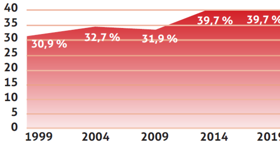 Im Jahr 1999 waren es dagegen nur 30,9 Prozent. Im Zeitverlauf sieht man in den Jahren 1999, 2004 und 2009 ähnlich hohe Quoten (30,9, 32,7 und 31,9 Prozent). Die Autoren des Surveys erklären die positive Entwicklung mit gesellschaftlichen Faktoren wie der Digitalisierung und der zunehmenden Zahl von Vereinen.