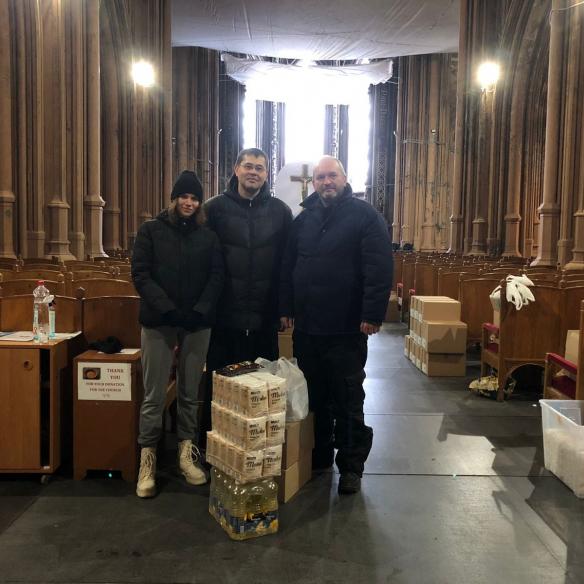 Seit Beginn der Invasion dient die Krypta unserer Kirche als Luftschutzkeller, in dem etwa 40 Personen, manchmal auch mehr, übernachten. Weitere 20 bis 30 Personen leben ständig im Keller des Klosters, um sich vor Beschuss zu schützen. Es handelt sich meist um junge Mütter mit Kindern, die einen sicheren Ort für ihre Kinder suchen und sich gegenseitig helfen wollen. Wir sind im Keller des Hauses. Hier wohnen wir, hier essen wir, hier kochen wir, hier beten wir.